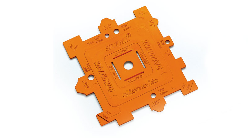 Měrka - pomůcka při broušení pilových řetězů - k zjišťování rozteče zubů řetězu a řetězky, tloušťky vodicích článků a šířky drážky vodicí lišty.