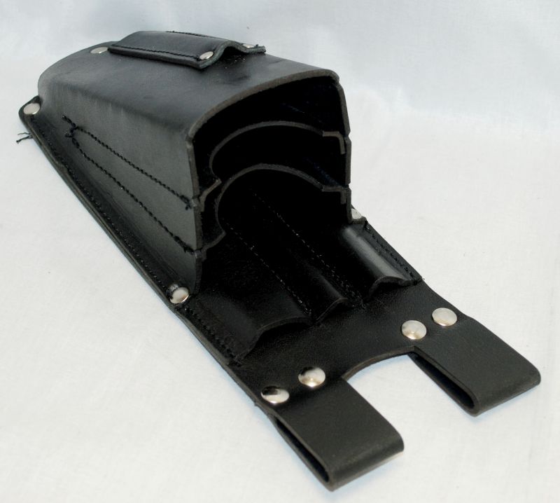 Kožené pouzdro na tři klíny s úchytem na držák křídy (přední část). Pouzdro má 3 poutka pro uchycení pilníků nebo jiných pomůcek na broušení řetězu (část u opasku) nebo klíčů na seřizování pily.