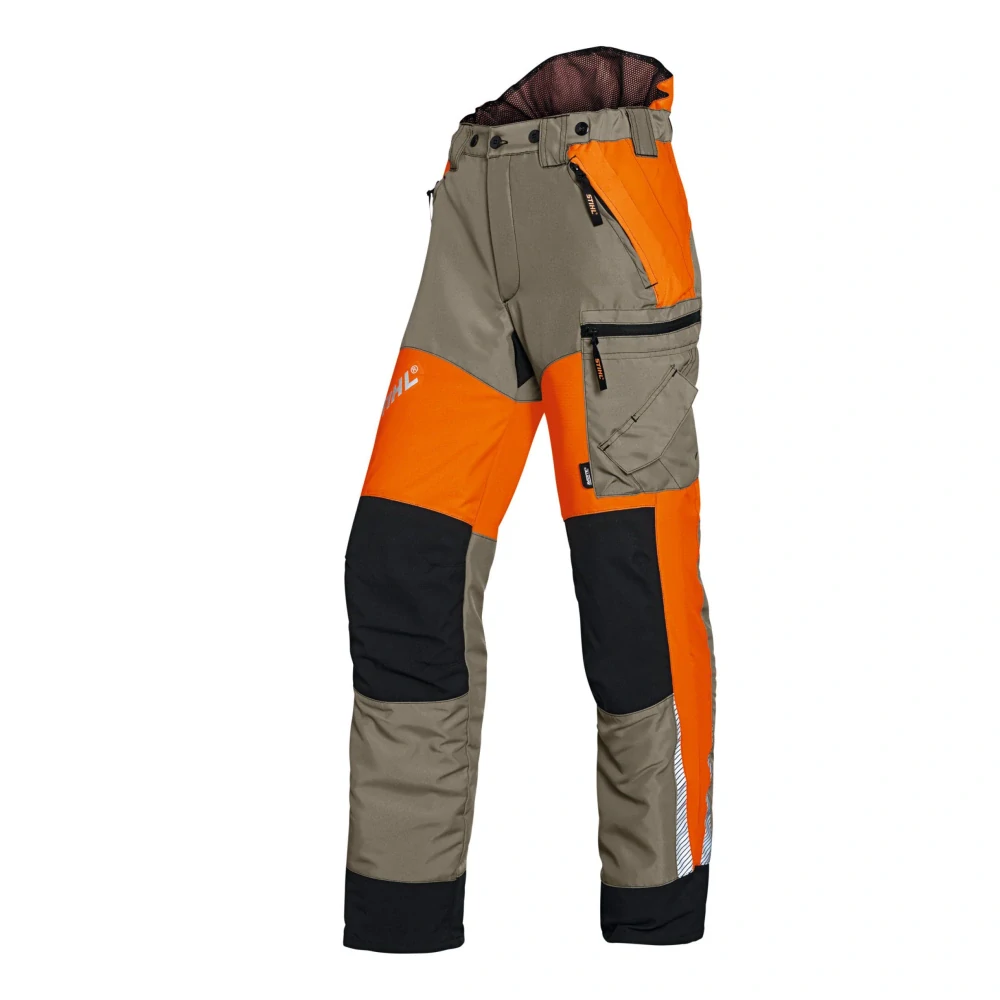 Velmi lehké, prodyšné kalhoty Stihl Dynamic Vent pro letní sezónu. S certifikovanou ochranou proti prořezu (EN 381), oranžová, černá a kaki, větrání na zip na stehně vzadu, elastická vnitřní vložka, reflexní detaily, vyztužení na kolenou, dvě přední kapsy na zip, kapsa na stehně, kapsa na mobil se zipem, ochrana proti vlhkosti v oblasti nohou.
