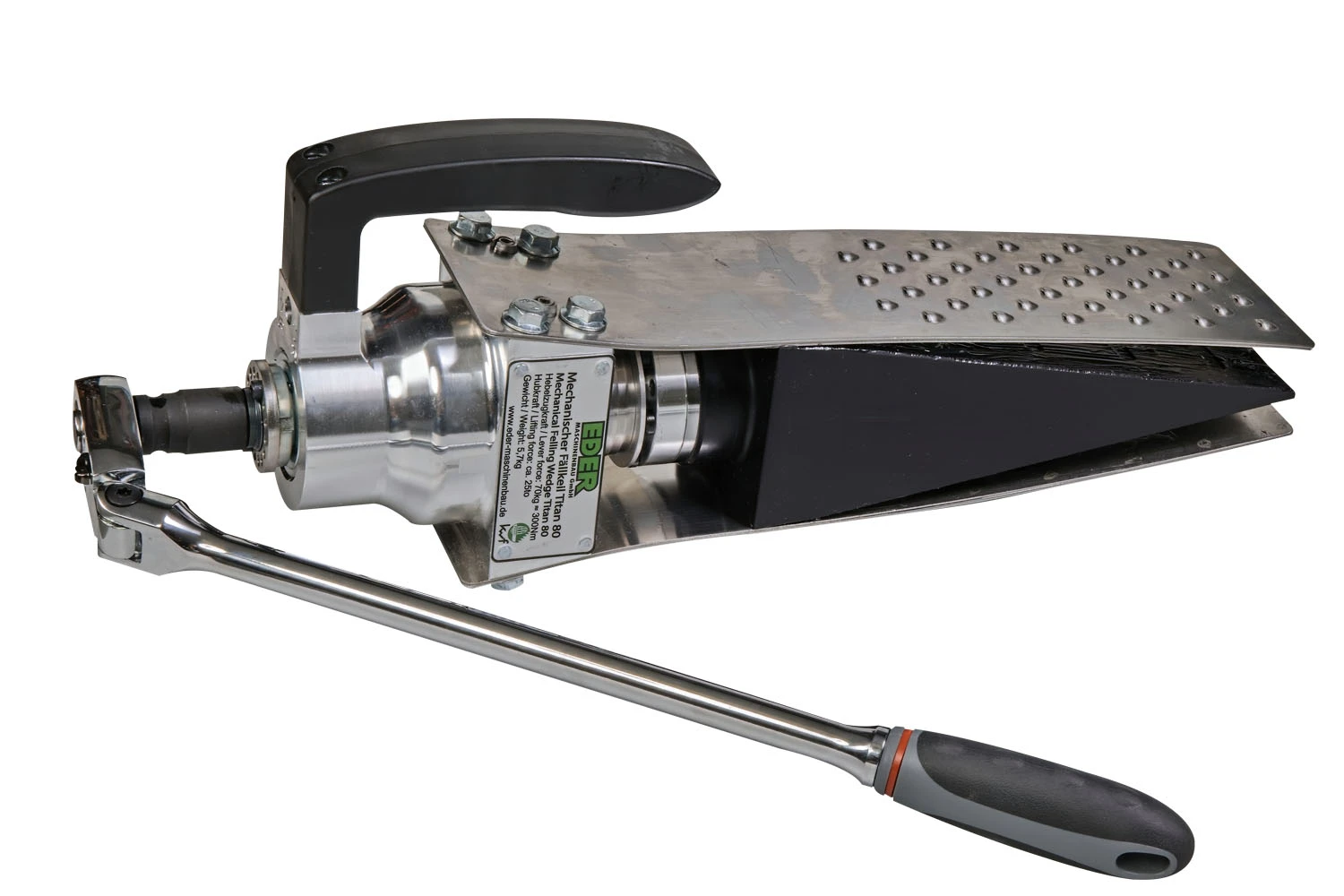 Tělo mechanického klínu je vyrobeno z hliníku s plastovým držadlem, zvedací klín je ze speciálního plastu. Zapouzdřený ocelový šroub je uložen v kuželíkových ložiscích. Díky tomu je velmi lehký a odolný.