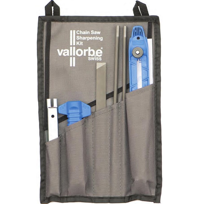 Profesionální sada Vallorbe obsahuje 1x kalibr, 1x rukojeť pilníku 25/30°, 1x pilník na hloubkový omezovač, 2x kulatý pilník, 1x kalibr na hloubkový omezovač. Pilníky s průměrem 4mm.