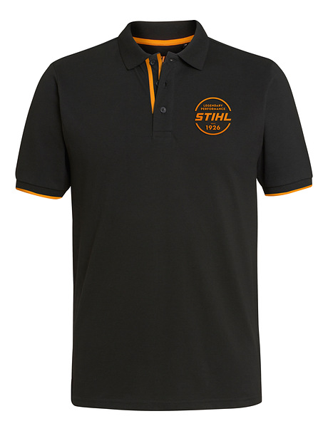 Černé pánské polo-tričko STIHL z řady STIHL FAN, materiál: 100% bavlna. Polotričko s krátkým rukávem v provedení Regular Fit z bavlněného piqué, boční rozparky a rýhované náplety s oranžovými proužky. Logo STIHL na prsou, ploché švy a oranžový dekor.