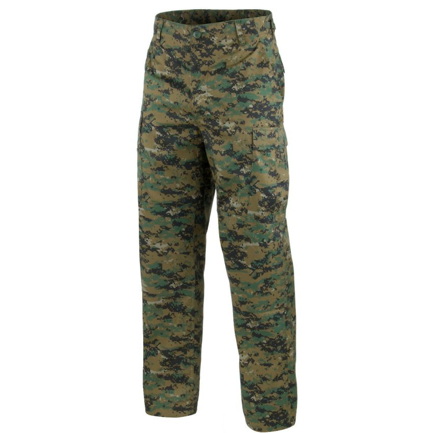 Maskáčové kalhoty pro muže, maskáče, army kalhoty. Kalhoty jsou ušity z pevného materiálu pro celoroční použití ( 65% polyester, 35% cotton ). Mají výztuhy na kolenou a v sedu, protože tyto části jsou nejvíce namáhány ! V pase jsou našity pásky z přezkou pro případnou úpravu pasu - pas lze snížit až o 4cm na každé straně ( proto ani nemusíte nosit pásek ). Kalhoty mají dvě velké kapsy po bokách, dvě kapsy ve předu a dvě kapsy na zadku. Na nohavicích jsou našity tkaničky pro stahování. Zapínání na čtyři knoflíky. Kalhoty jsou praktické a pohodlné, jsou určené pro přežití v těžkých přírodních podmínkách. Vydrží Vám věčnost !!!