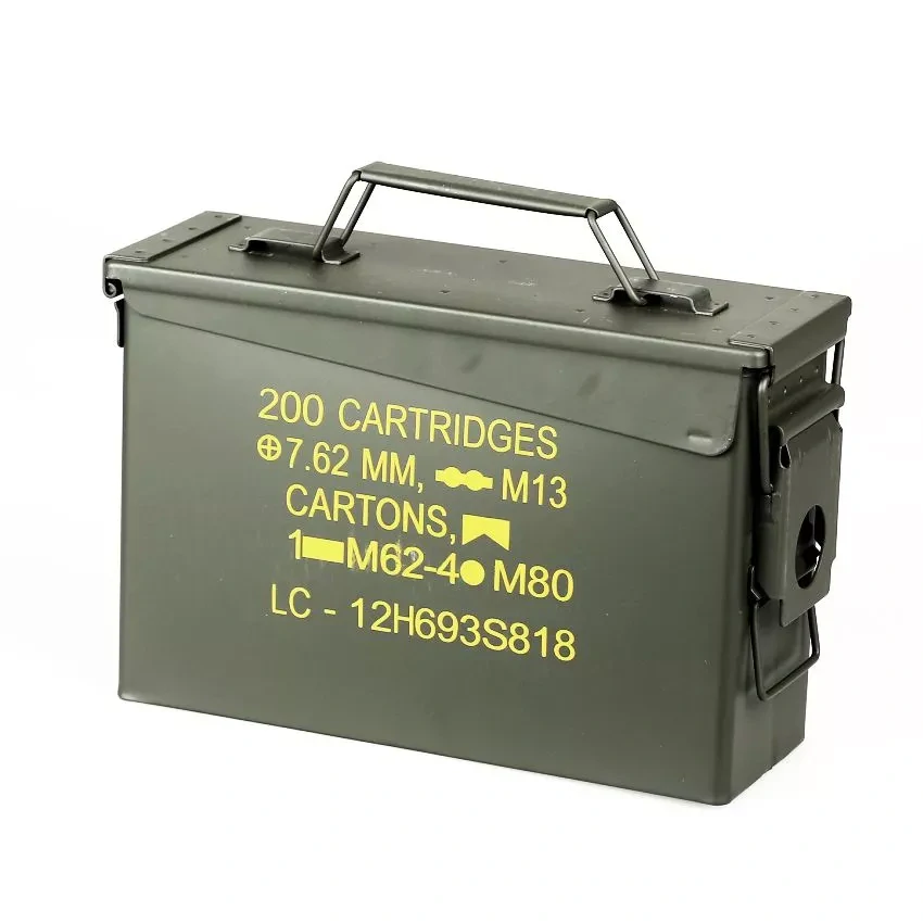 Bedny jsou colokovové, ve vojenské khaki barvě, opatřeny nápisy s označením druhu střeliva. Po bokách jsou praktické úchyty pro přenášení. Bedny jsou pečlivě těsněné proti vlhkosti gumovými obručemi. Výborná dekorace - doporučujeme !