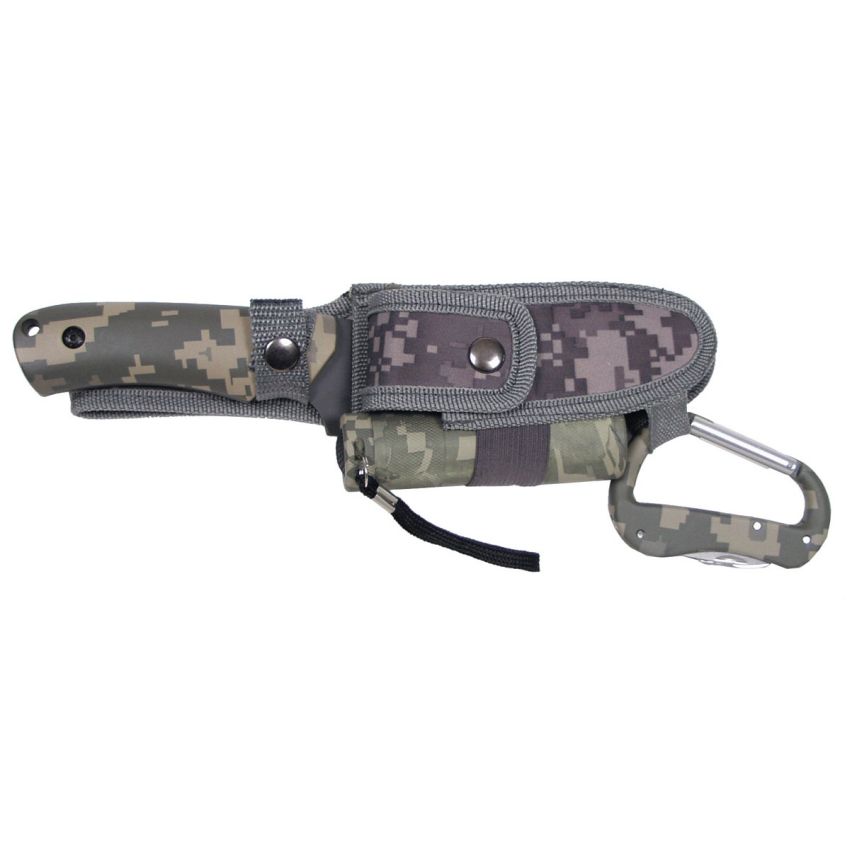 Karabinka - pevné ocelové oko, uzavírané pérovým mechanismem, sloužící hlavně jako spolehlivý spojovací doplněk. Je určena ke spojování běžných doplňků výstroje, má mnohostranné využití ( není určeno k horolezectví ). Pojistka karabiny se otevírá jednoduchým pohybem prstu, tvar dobře padne do ruky. Karabina je navíc v těkle opatřena zavíracím nožíkem, otevírákem, plochým šroubovákem, pilníkem a nůžkami. Jelikož je umístěna na samotném pouzdru, lze s ní i připevňovat celý set k jakékoli části výstroje.