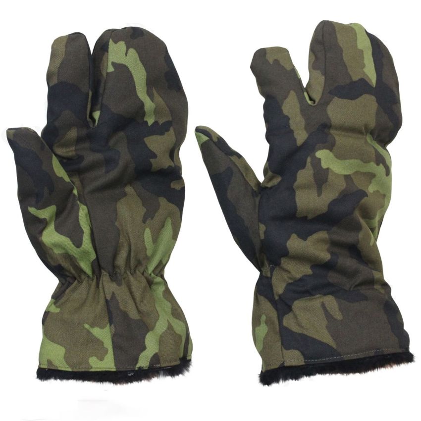 Vojenské rukavice, army oblečení a doplňky. Rukavice jsou "Tříprsté" v maskovacím provedení vz. 95, jsou zateplené umělou kožešinou v černé barvě. Samostatný palec a ukazovák umožňují dobrou manipulaci s předměty a v krajním případě potřeby i střelbu.
