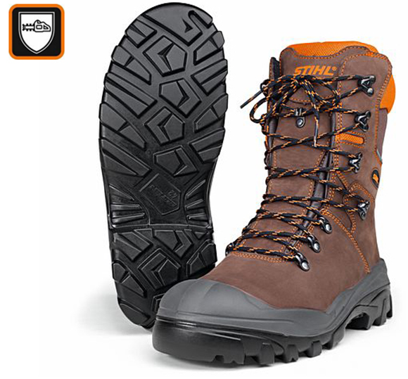 Kožená lesnická obuv Stihl pro práci s motorovou pilou s ochrannou proti pořezání, vrchní strana z nepromokavého nubuku, tlumivá protiskluzová podrážka