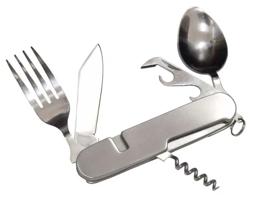Turistický rozkládací 4 dílný jídelní příborový set ve tvaru klasického zavíracího nože + přepravní pouzdro.