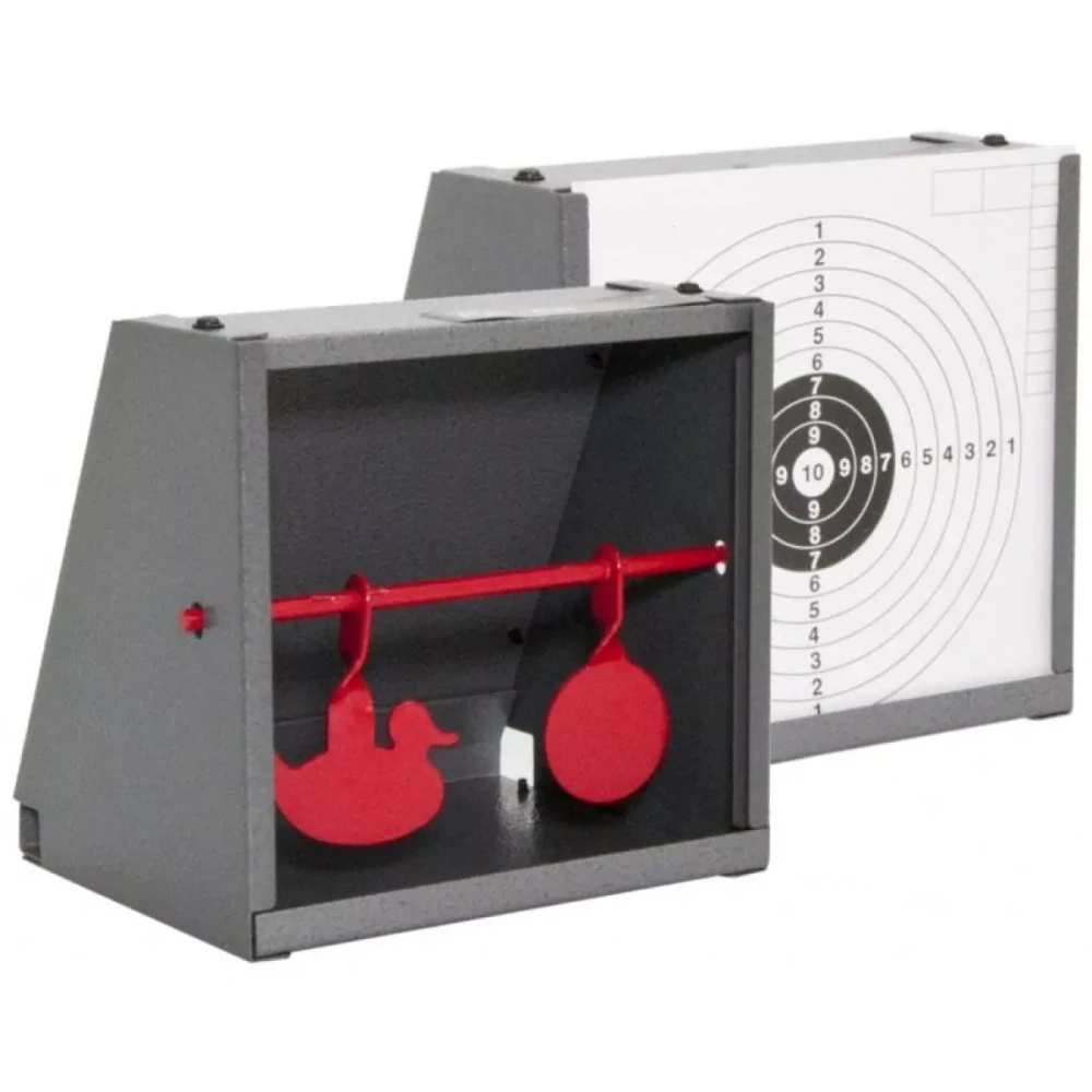 Vyrobeno ze smaltovaného plechu kastlíkové konstrukce, určeno k zachycení olověných diabolků ze vzduchovky (vhodné pro pušky do 16 J), lze využít pro klasické papírové terče 14 x 14 cm, případně jako střelnici na dva otočné cíle.