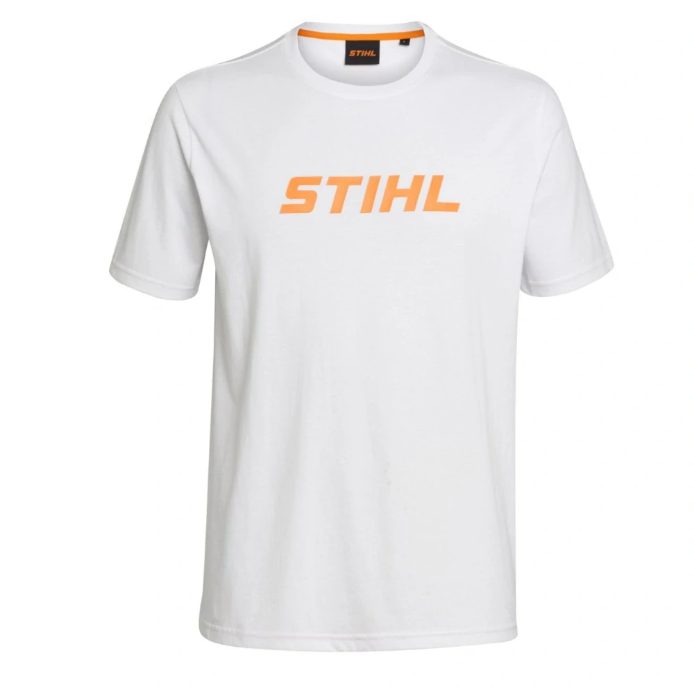Bílé tričko s kulatým výstřihem z kvalitního 100% bavlněného jersey s velkým logem STIHL v kontrastní oranžové barvě. Štítek s logem STIHL na vnitřní straně, další oranžové logo na vnější zadní straně.