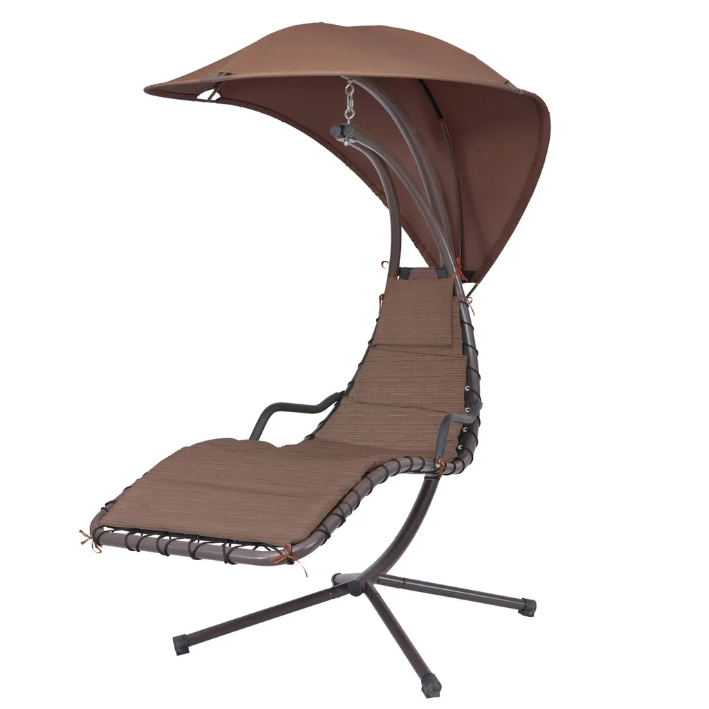 Součástí křesla je pohodlné polstrování, které zvyšuje komfort při relaxaci. Integrovaná stříška slouží jako sluneční clona a chrání uživatele před přímým sluncem, což umožňuje příjemný odpočinek i v horkém počasí.